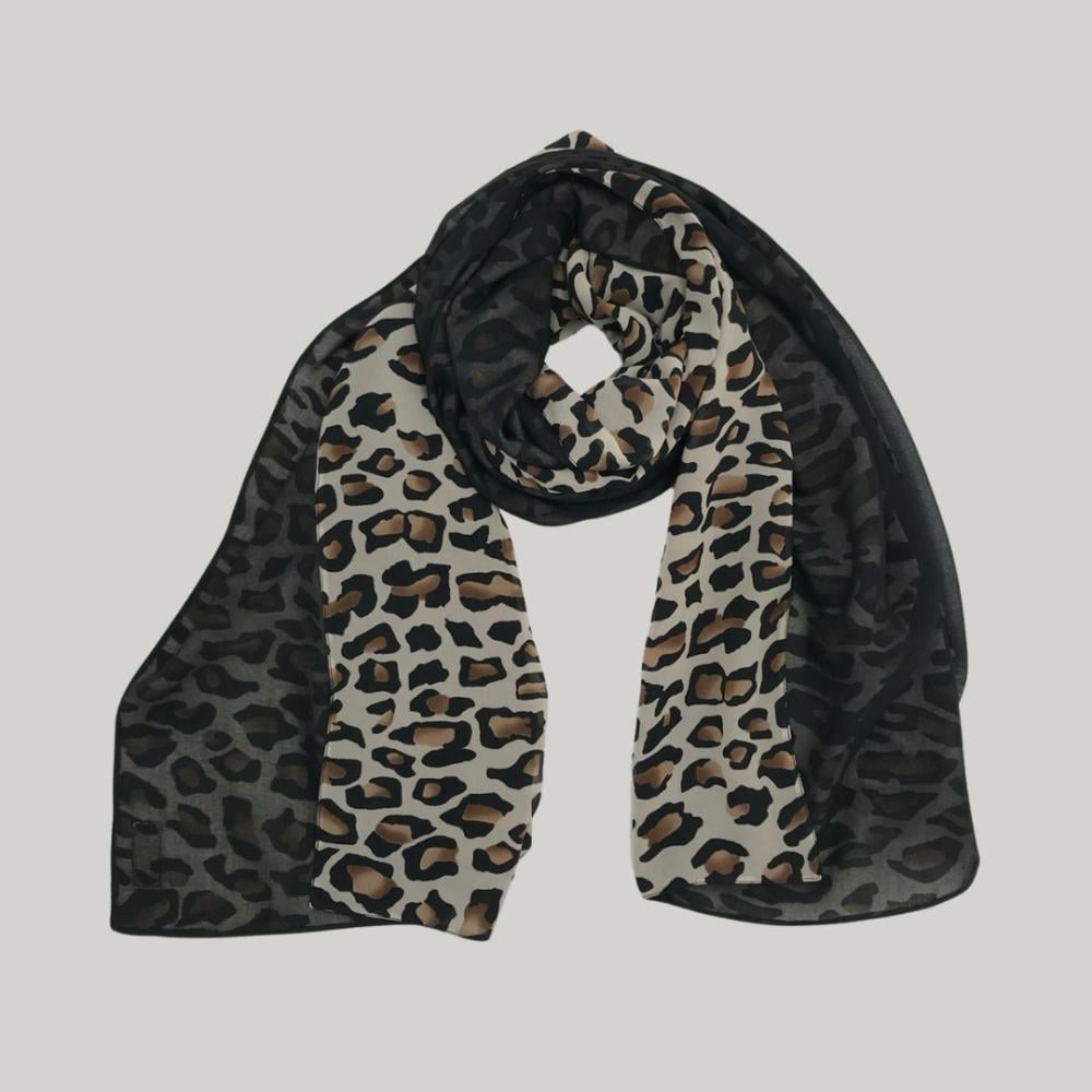 - - الوجه الثاني: خامة الشيفون بنقشة النمر الجذابة التي تضيف لمسة عصرية وجريئة، مثالية للإطلالات اليومية أو لإضافة لمسة من التميز.